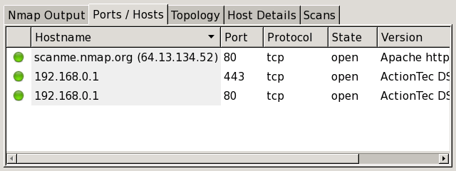 The “Ports / Hosts” tab's display differs depending on whether a host or a service is currently selected. When a host is selected, it shows all the interesting ports on that host, along with version information when available. Host selection is further described in the section called “Sorting by Host”.